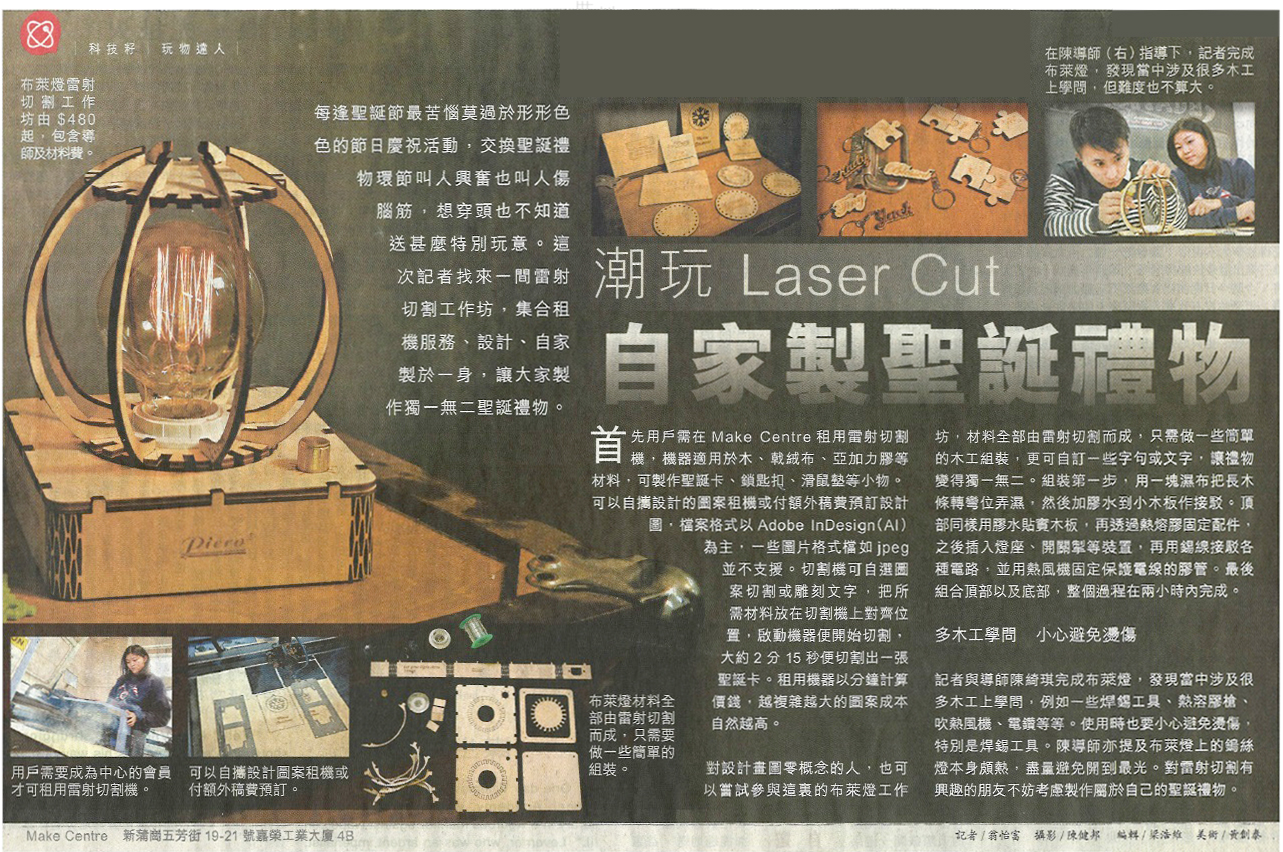 另外,部分木工製品如藍牙喇叭、星球儀、化妝盒這些造工較複雜細緻的成品,在製作時,導師會指導學生使用雷射切割機,這項技術能夠快速精準地將木材切割至理想的形貌,對木工經驗不多的人很有幫助。如果想挑戰高難度,也可嘗試製作椅子或收納櫃等大型家具,這類作品體積較大,需時較長,工序亦較繁複,不過Larry說只要多花一點心思和耐性,要完成也並不是難事。